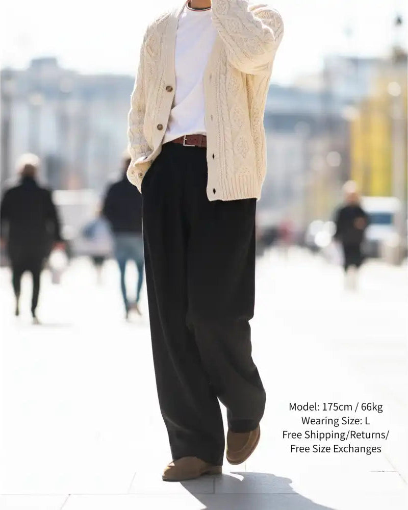 **「ハイブランドと同じ工場」**で作られるこのパンツは、生地のレベルが違います。 ペラペラのポリエステルではなく、コートのような重厚感とハリを持つ特注生地を採用。 その圧倒的な生地の力が、シワやヨレを許さず、美しいシルエットを強制的にキープします。 手に取った瞬間、「あ、これは高いやつだ」と確信するはずです。